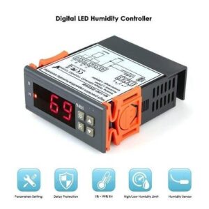 The mini digital humidity controller can set a high or a low humidity limit, when the humidity is beyond the compass of limits, it will humidification or dehumidification automatically. This 220V digital humidity controller uses high precision capacitive chip, high accuracy and wide humidity measuring range. The digital humidity controller features a clear and large LED display for best adaptability. The digital humidity controller measures the relative humidity inside the chamber. The 220V mini digital humidity controller has PU delay protection function. All the parameters of the digital humidity controller can be set to default setting after short circuit. This mini digital humidity controller is great for many applications industrial, laboratory, personal and hobbies. The digital humidity controller can be used for domestic freezer, water tanks, refrigerators and industrial chillers.