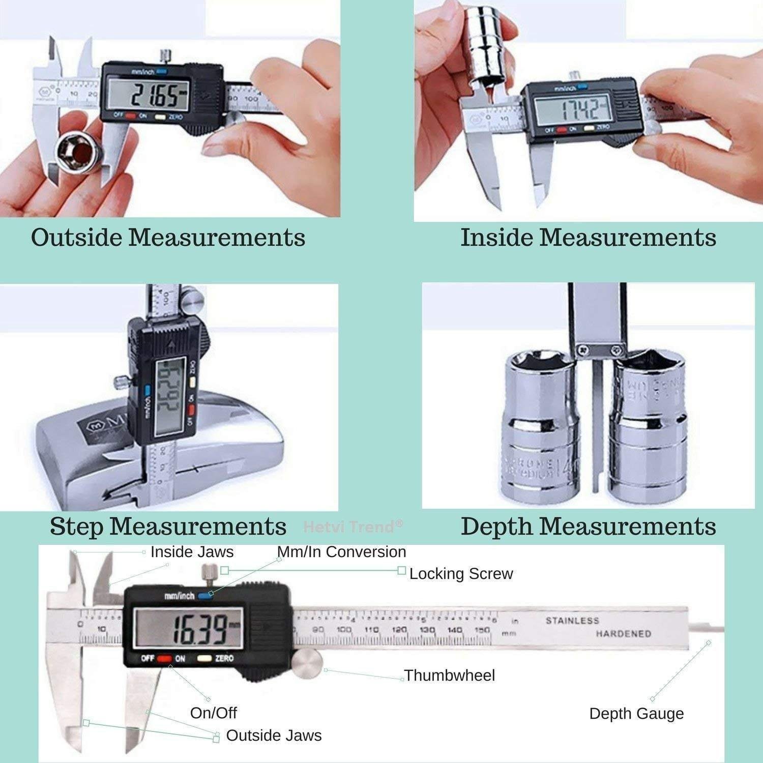 4-Way Measurement: Measures Outer Diameter (OD), Inner Diameter (ID), Depth, and Step.